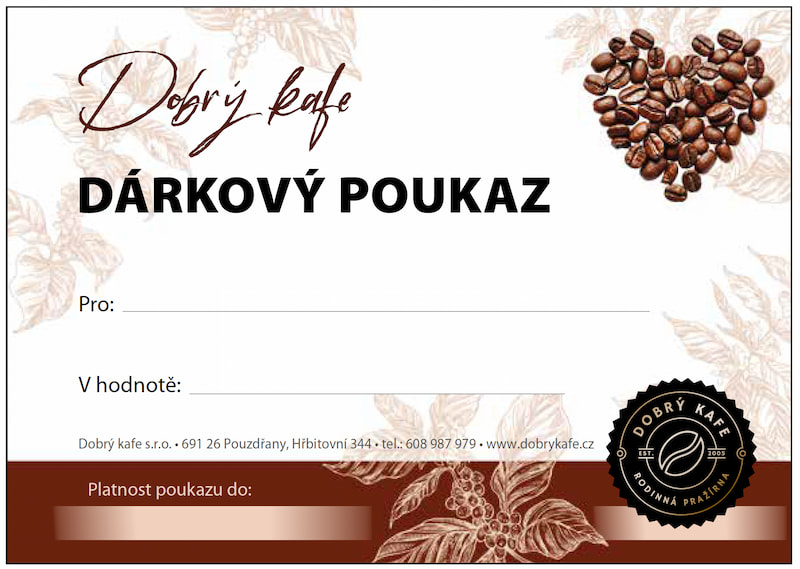 Částka poukazu je libovolná. Poukaz vám pošleme elektronicky i vytištěný. Stačí nás kontaktovat telefonicky: 608987979 nebo e-mailem chci@dobrykafe.cz. Dárkové poukazy můžete zakoupit i online v našem e-shopu.